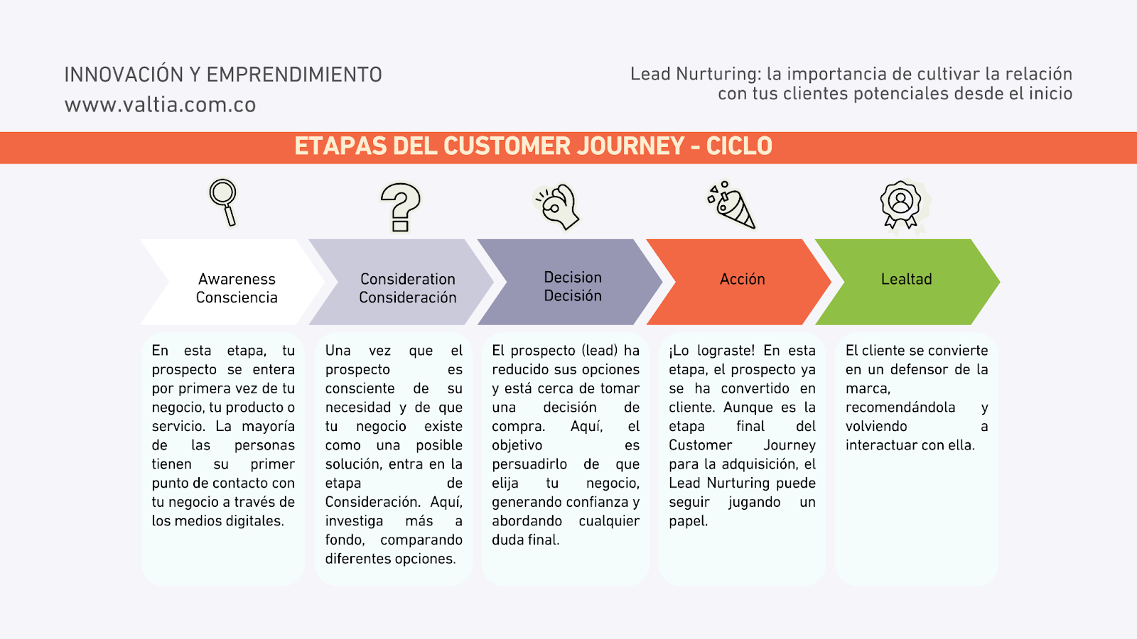 Como mencionamos en la introducción, el Lead Nurturing se centra en acompañar a los prospectos a lo largo de su recorrido como compradores. Comprender a fondo el Customer Journey es el primer paso esencial para diseñar una estrategia de Lead Nurturing efectiva, ya que nos permite identificar los puntos clave donde podemos interactuar y ofrecer valor a nuestros prospectos.