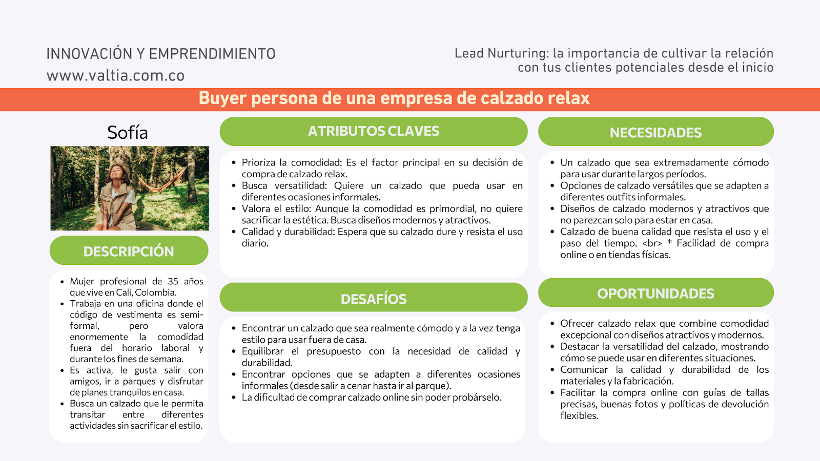 Se trata de idear un personaje ficticio que describe a tu cliente ideal de manera muy específica, definiendo desde su nombre, edad, ubicación, hasta aspectos más profundos como sus intereses, sueños, comportamientos, hobbies, desafíos o momentos de crisis. Darle un nombre y construir una pequeña historia alrededor de este personaje ayuda a humanizarlo y facilita la creación de estrategias más enfocadas. Por ejemplo: Sofía es definida como buyer persona para una empresa de calzado relax.