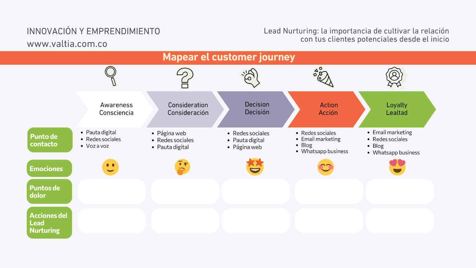 Ya conociste la definición del customer journey y las diferentes etapas por las que puede pasar tu cliente. Ahora es el momento que hagas un mapeo de los posibles puntos de contactos que puede tener tu cliente con tu marca en cada una de las etapas.  Este es un modelo con el que te puedes guiar para completar tu mapa de customer journey: